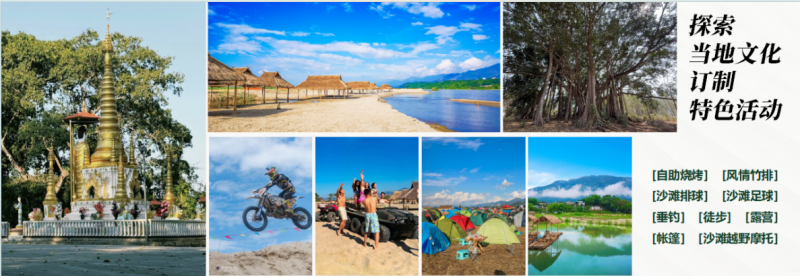在史迪威码头渡口遗址附近,游客可以体验横跨瑞丽江的溜索,感受疾风在耳畔呼啸、脚下江水奔腾的刺激体验。商业街展示出售当地民族非物质文化遗产的工艺品、饰品,以及各类热带水果、特色产品,让游客亲临充满民族风情的特色街头。翡华SPA将海洋、大地、温泉、森林与SPA理念完美结合,通过满足视觉、触觉、嗅觉、听觉,达到身心灵的畅快感受。